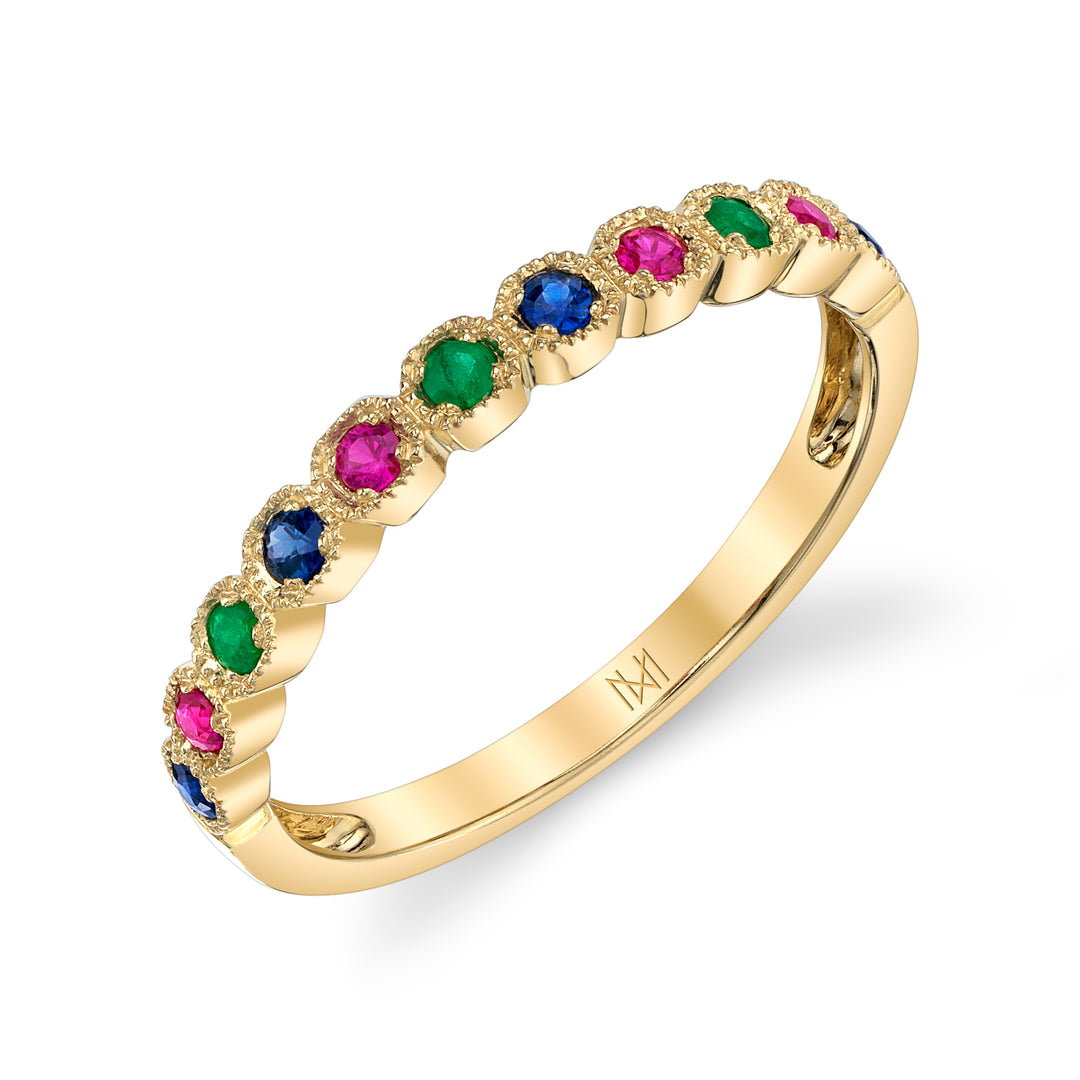 This colorful band reminds us of Fiesta San Antonio! Full of color and vibrancy! This Colorful "Fiesta" Gemstone Stackable Band in 14K Gold is the perfect little pop of ruby, emerald and sapphire, 0.24ctw, to add to your ring stack. This band is set 1/2 way but it can also be personalized by metal and finger size. If you would like to customize this band with gemstones or larger stones or in Platinum, please contact us info@nicolemera.com.