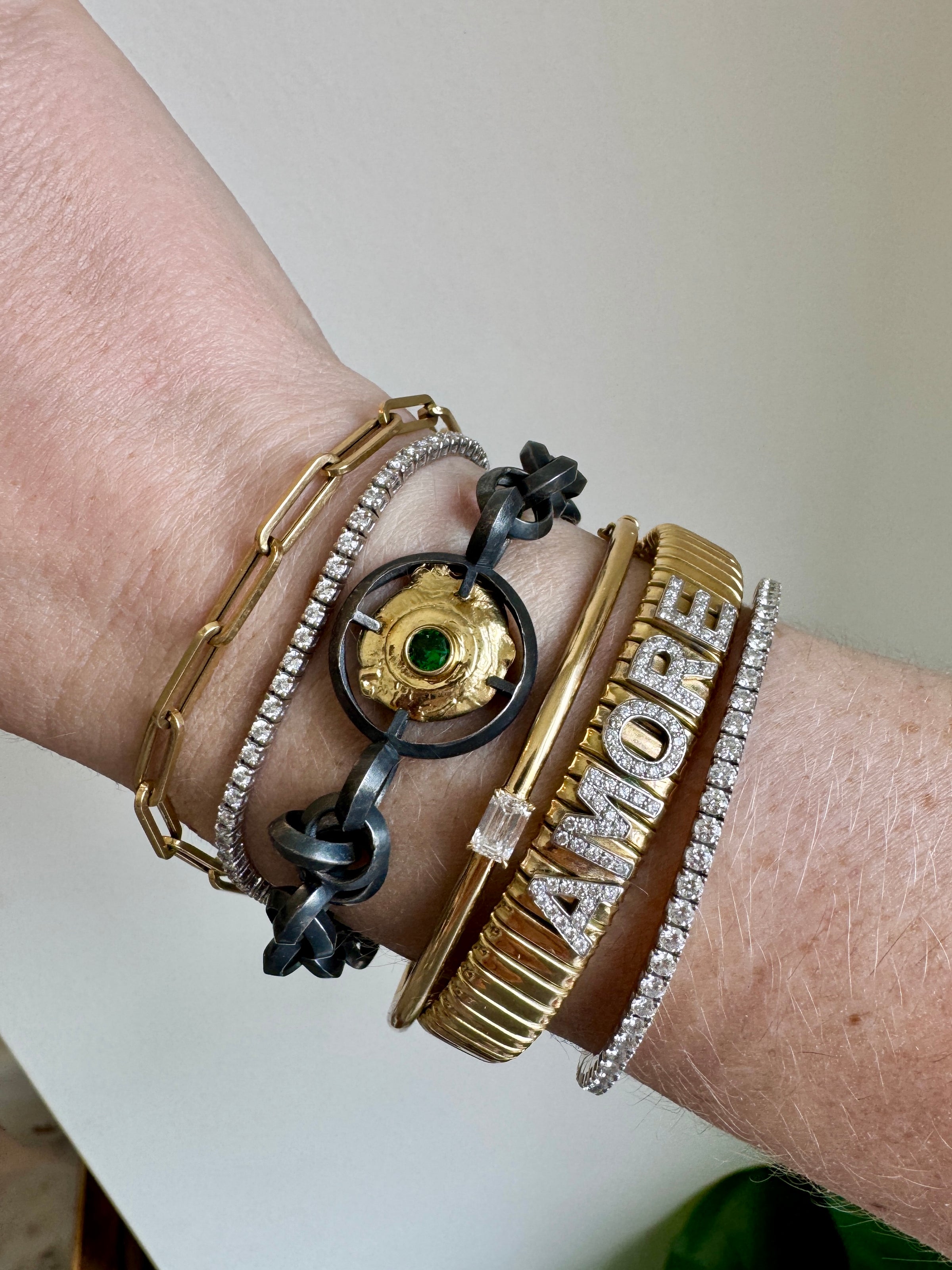Designed to be worn by both men and women, this collection begins as a bullet casing—flattened, reshaped, and transformed into a powerful emblem of resilience and personal evolution. Crafted in 18k gold and blackened sterling silver, the designs reflect strength with edge, elegance, and intention.