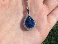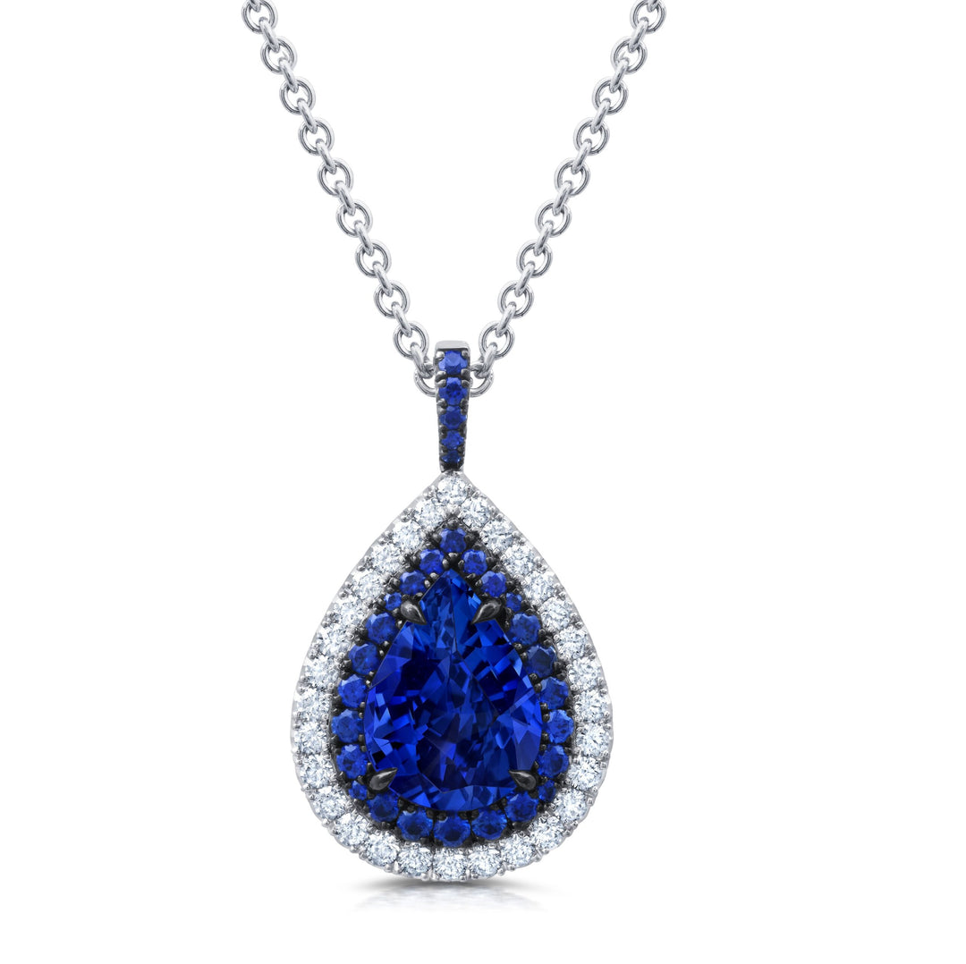 From our Signature Collection, This Drop Necklace features a rich 2.82ct Pear Shape Sapphire at the center surrounded by a perfectly matching halo of Sapphires and a delicate and seamless Halo of White Diamonds, 0.32ctw . This pendant also has a little special detail, sapphires in the bale that provides a little bit of uniqueness in this custom piece. Known as the birthstone for September and the gem of the 5th and 45th anniversaries. Sapphires traditionally symbolized sincerity, truth, faithfulness, and nobility.