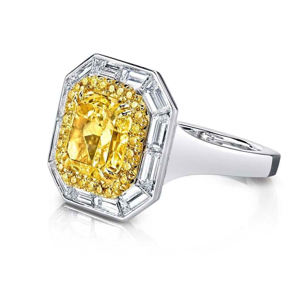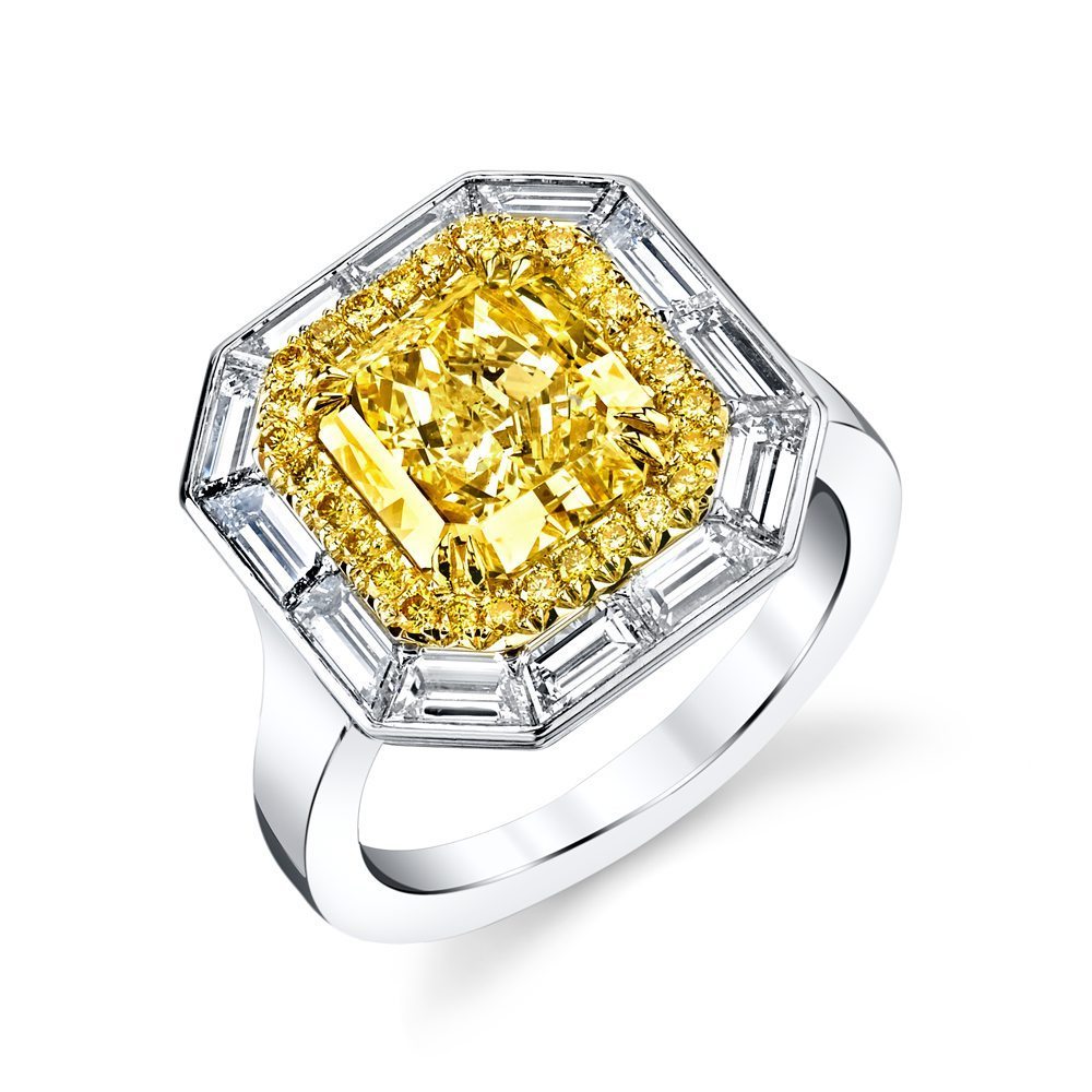 This timeless hand fabricated ring holds a glowing 3.02ct Radiant Cut Natural Fancy Yellow Diamond surrounded by a halo of 28 Fancy Yellow Diamonds, weighing 0.23ct, which are then surrounded by 12 Baguette Diamonds, weighing 1.69ct.