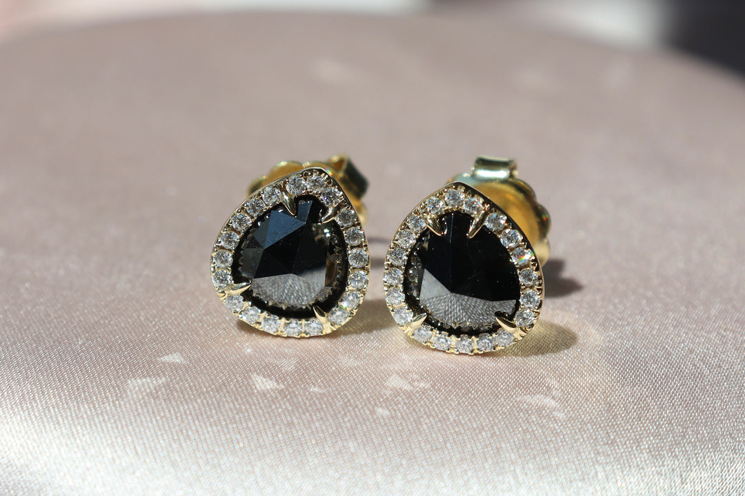 3.06ctw Pear Shape Rose Cut Black Diamond Stud Earrings in 18K Yellow Gold