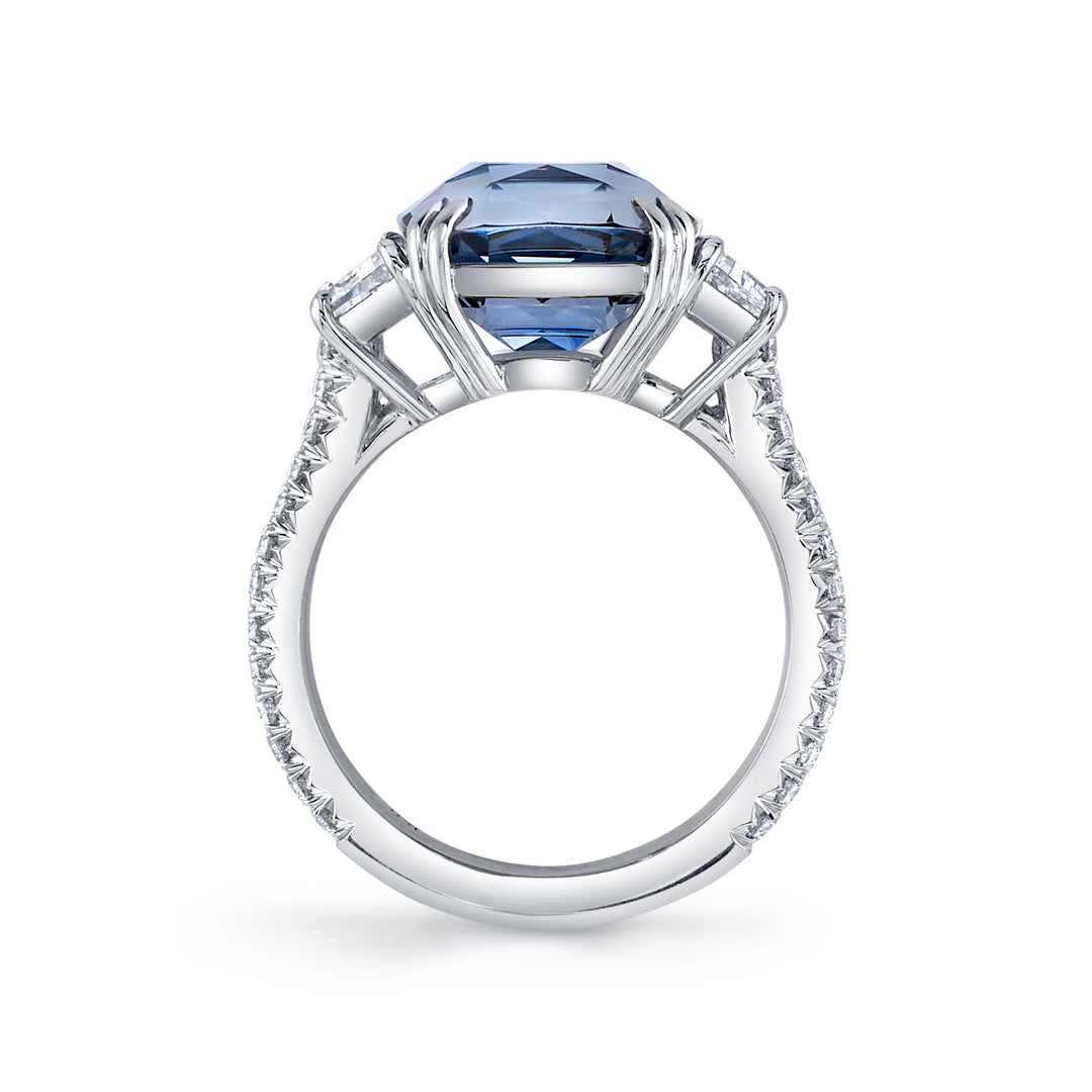 From our High Bridal Collection, this gorgeous Platinum ring features a 6.38ct Cushion Blue-Grey Spinel flanked by two trapezoid diamonds, 0.80ctw and a double row pave shank of bright white diamonds, weighing 0.57ctw. This can be the perfect addition to an already fabulous jewelry collection or could make the perfect Engagement Ring for someone looking for something a little unique and different than a traditional diamonds.