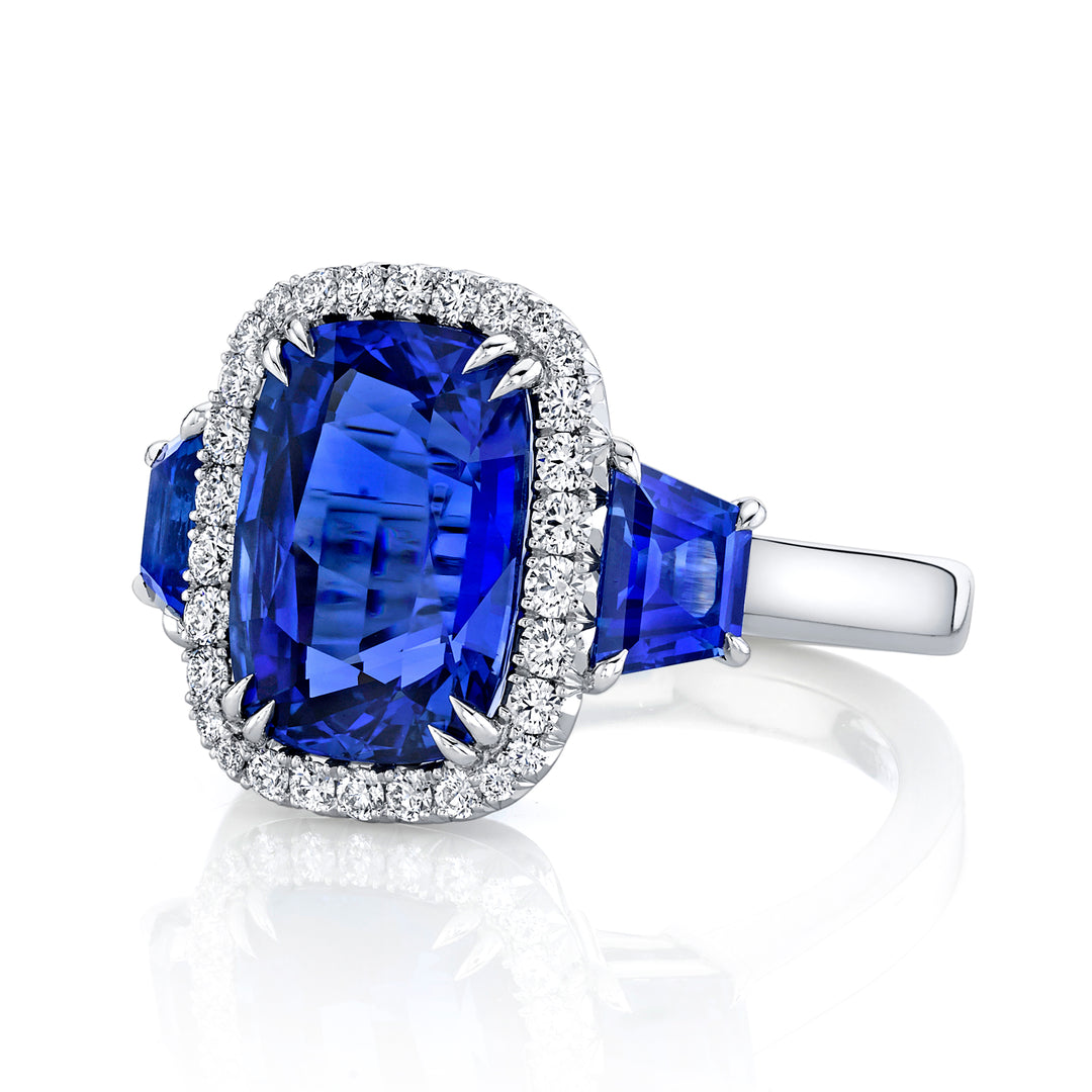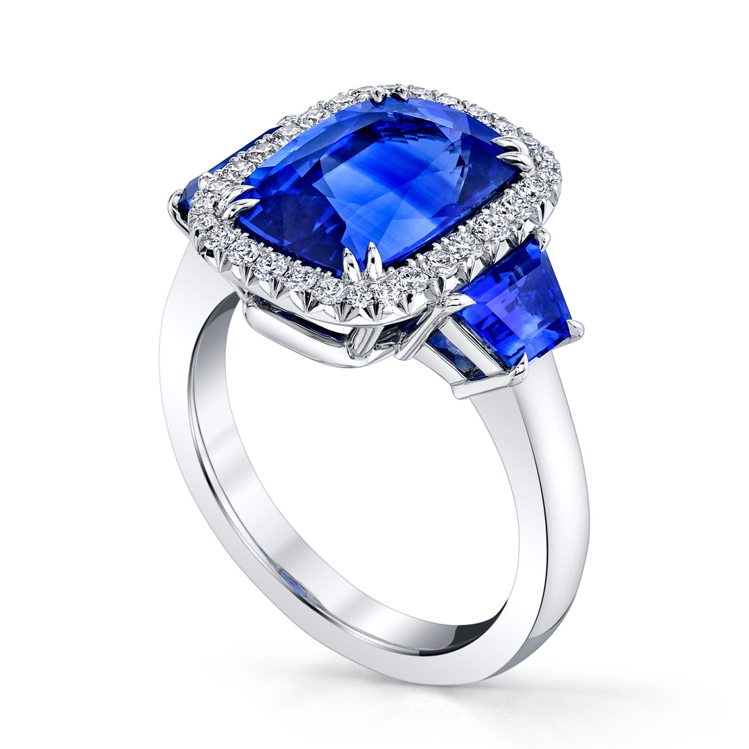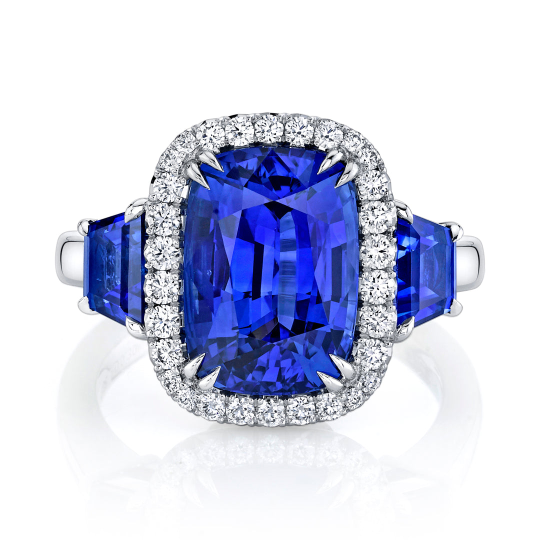 From the Signature Collection, This incredibly unique Platinum ring features a velvety rich elongated 5.70+ct Cushion Sapphire surrounded by a delicate halo of bright white diamonds and two matching custom cut Sapphire Trapezoids. The center sapphire is Certified.