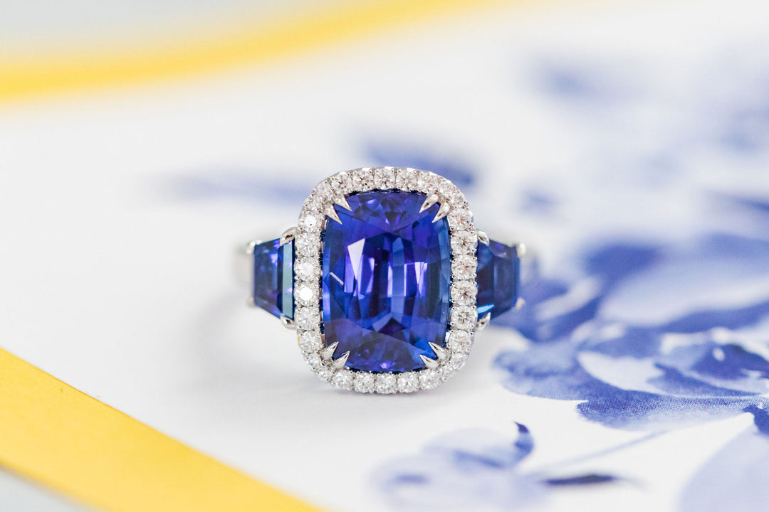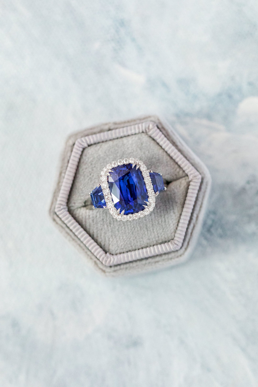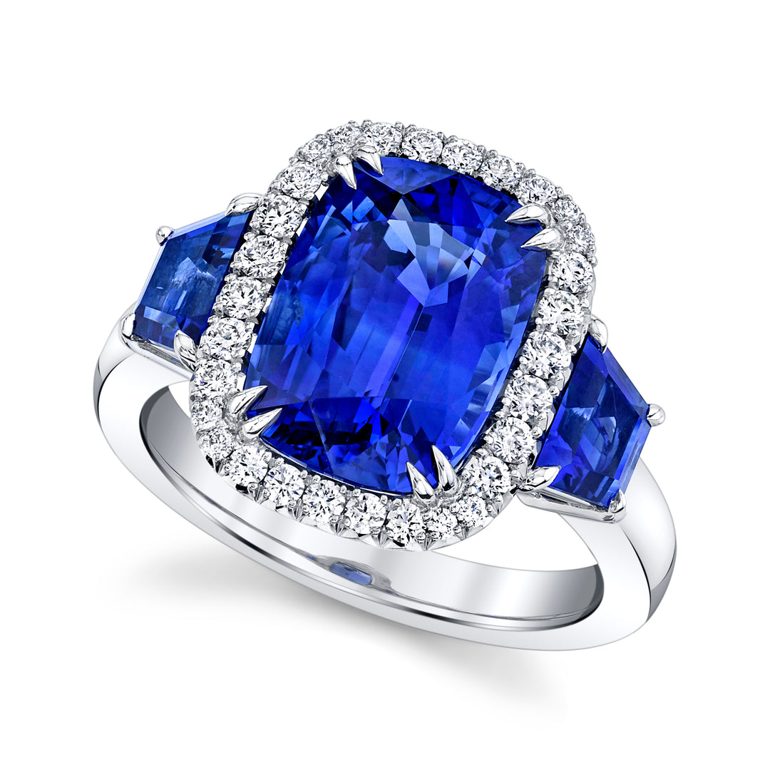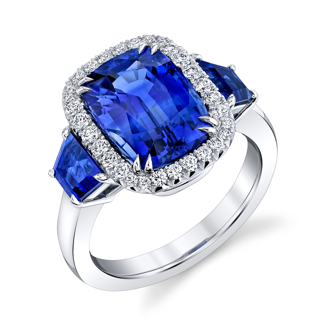 From the Signature Collection, This incredibly unique Platinum ring features a velvety rich elongated 5.70+ct Cushion Sapphire surrounded by a delicate halo of bright white diamonds and two matching custom cut Sapphire Trapezoids. The center sapphire is Certified.