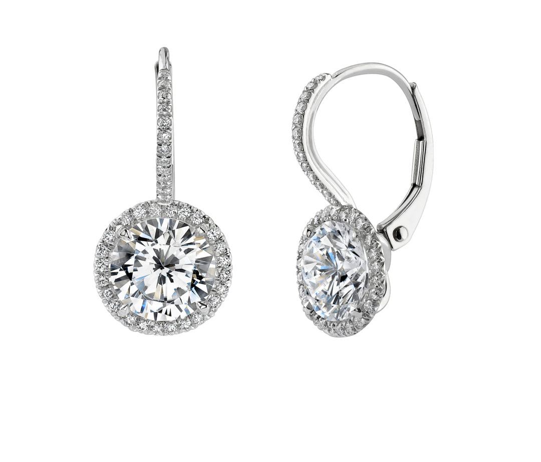 The earrings shown feature two Round Brilliant Diamonds, each with round halos hanging from a diamond leverback wire.