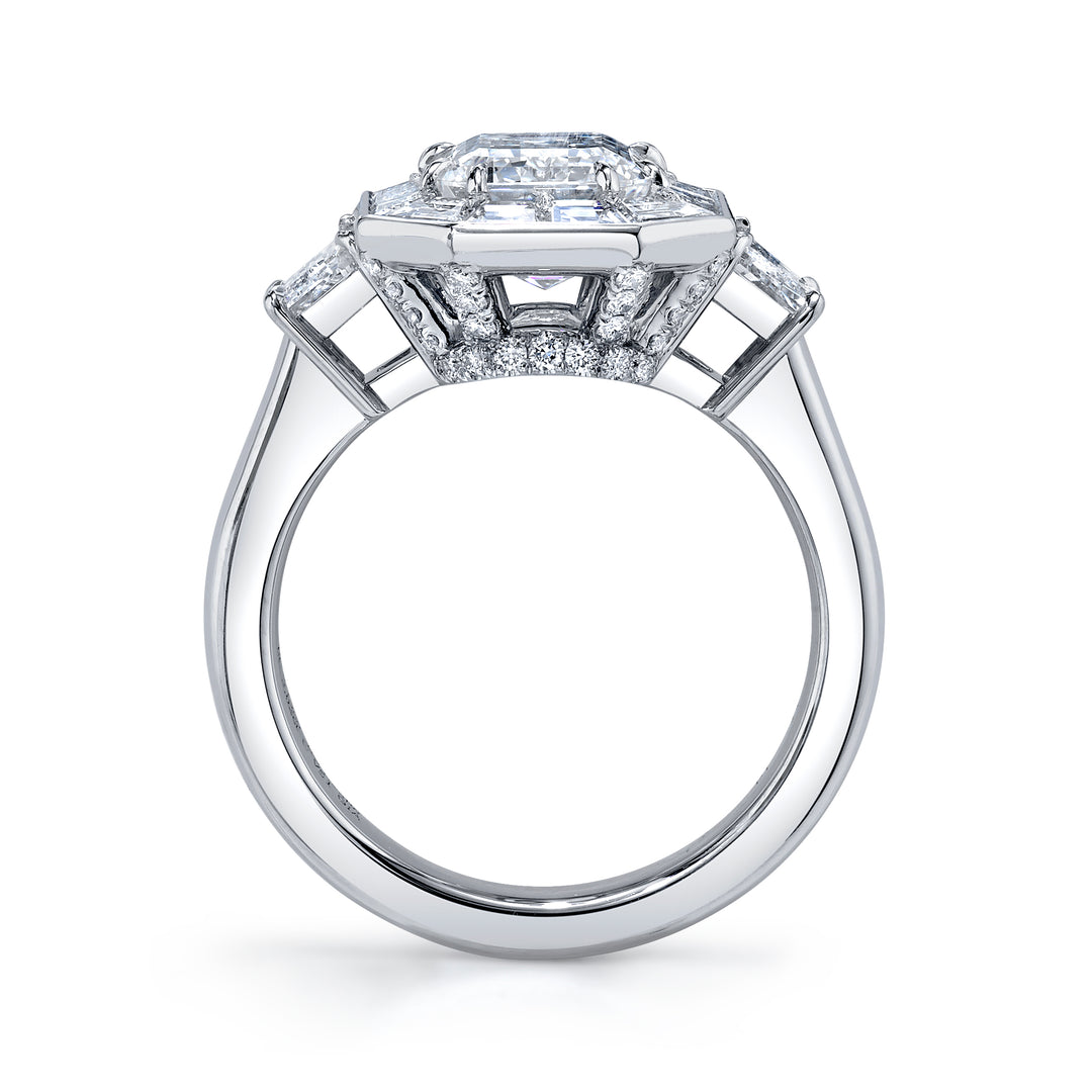 From the Signature Collection, this extraordinary Platinum ring holds a 3ct+ Emerald Cut GIA Diamond at the center. The center diamond is accentuated by a row of baguette diamonds and flanked by two Trapezoid Diamonds. There are also small pave diamonds in the under gallery to provide that hidden peek a boo detail. The center Diamond is GIA Certified.