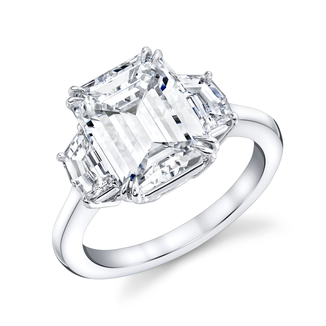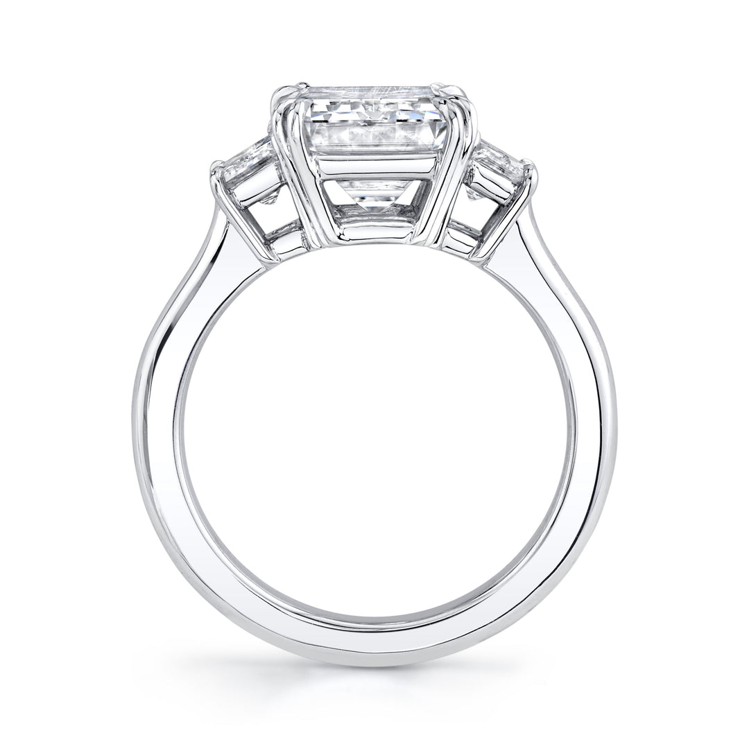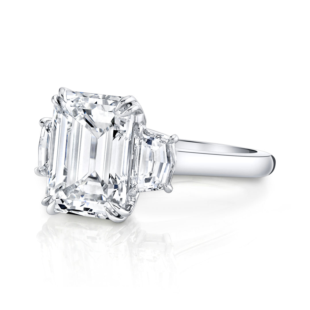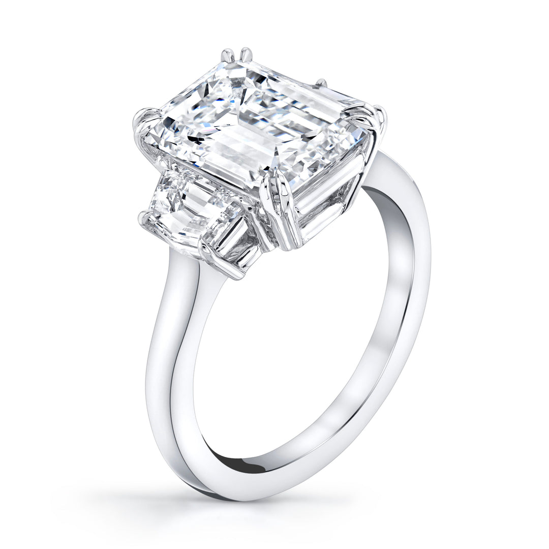 This classic three stone ring features a 4.50ct+ Emerald Cut Diamond center. The ring pictured has sold. If you are looking for a similar diamond or design, please contact us.