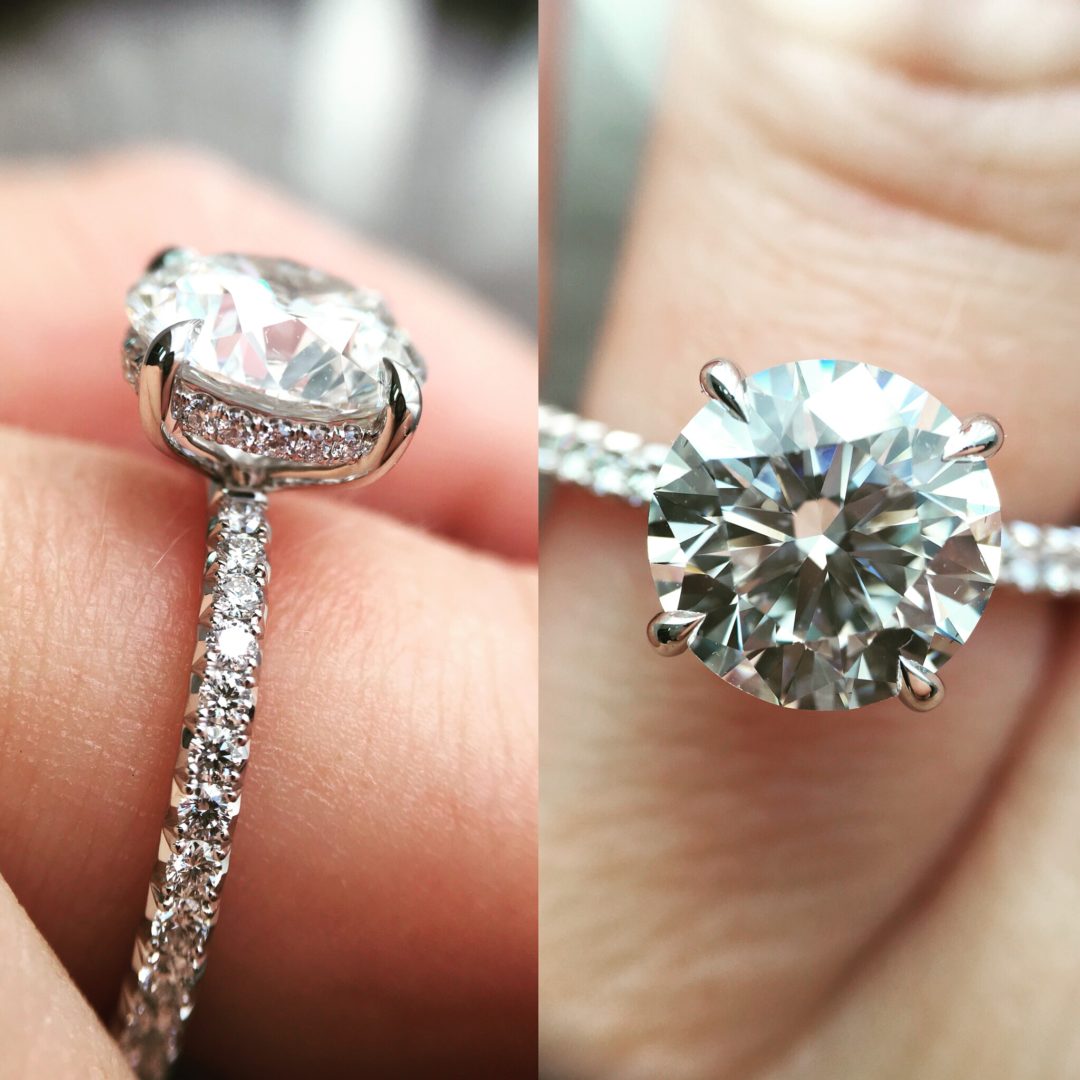 This Platinum delicate solitaire ring shown is set with a 1.00ct Round Brilliant Diamond center surrounded by 44 Round Brilliant Diamonds, weighing 0.41ct. Video shows a 1.05ct Cushion G SI1 GIA Diamond.
