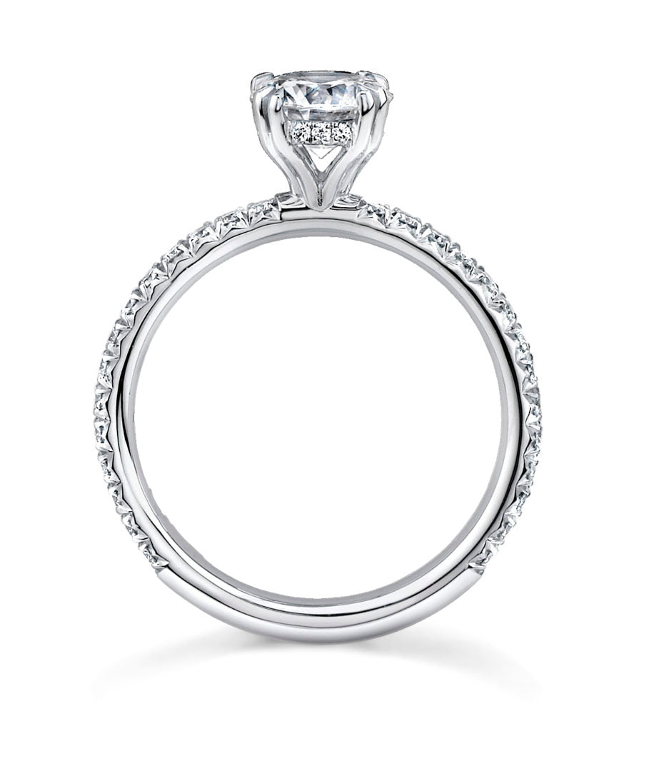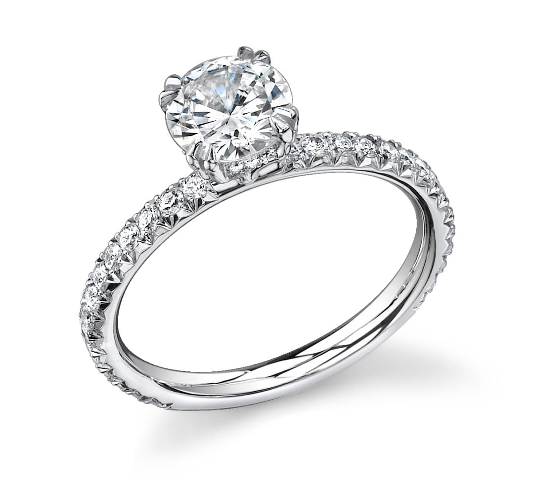This classic bridal ring is a made-to-order custom design. It can be hand fabricated in Platinum or any 18K Gold metal. This ring can be modified to accommodate any size, shape, or color center stone.