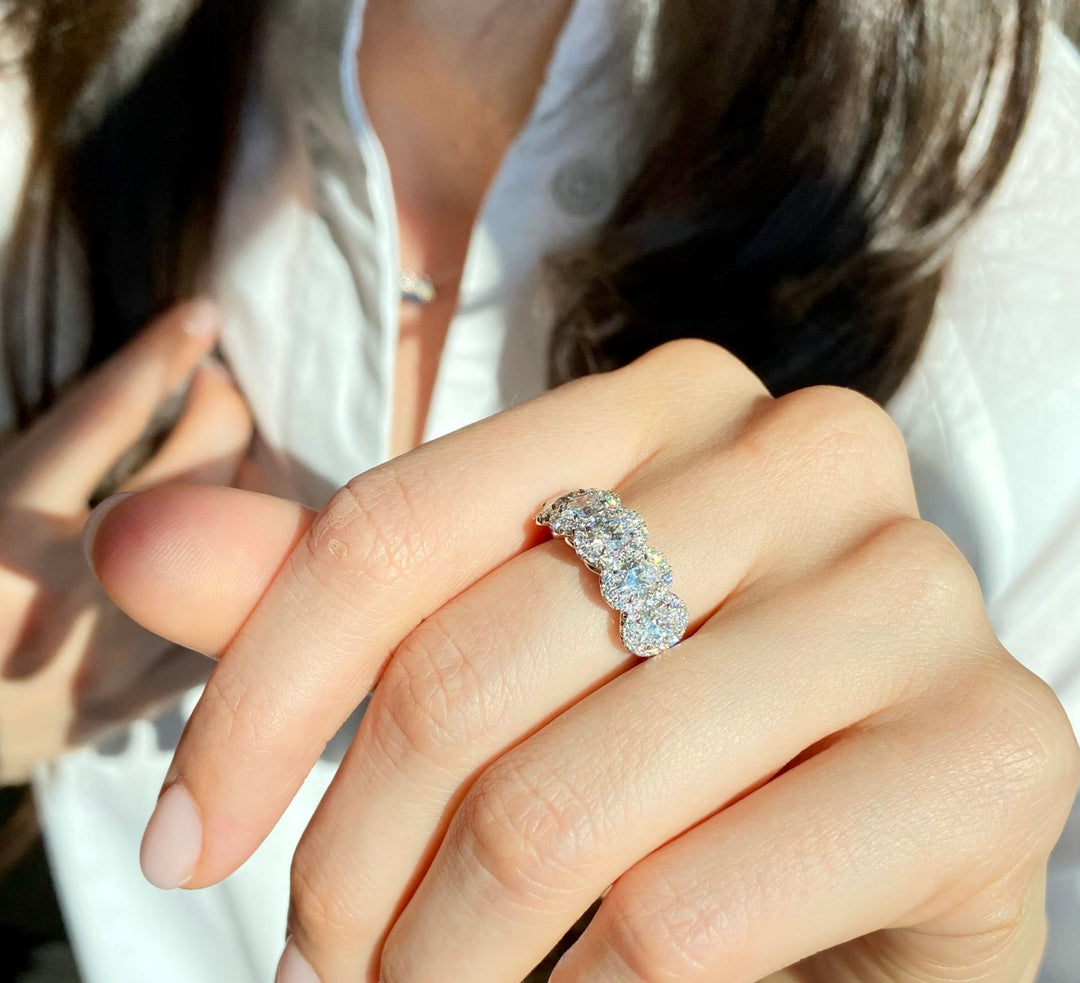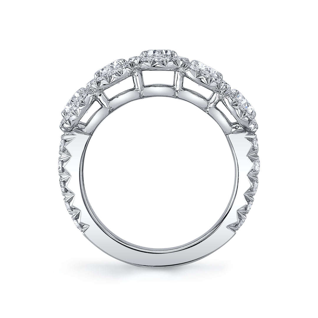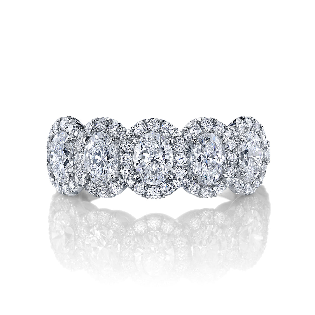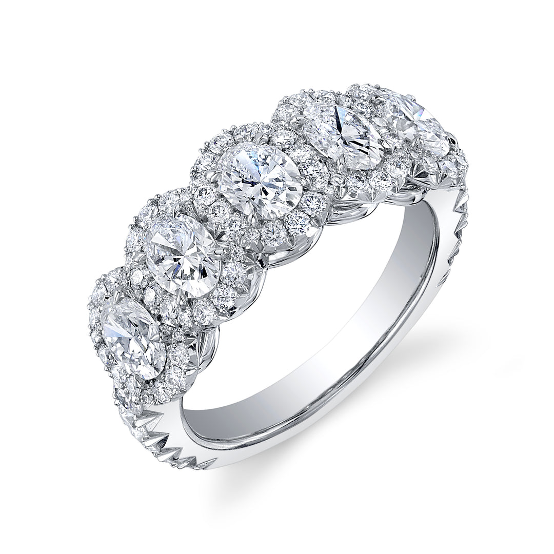 From our High Bridal Collection, this hand fabricated Platinum band design features approximately 1.50ctw Oval White Diamonds at the center surrounded by petite Round Brilliant Diamond halos and Round Brilliant Diamonds down the shank. Order this Platinum band below by selecting your finger size. To customize this band in a different metal or diamond shape, please email info@nicolemera.com