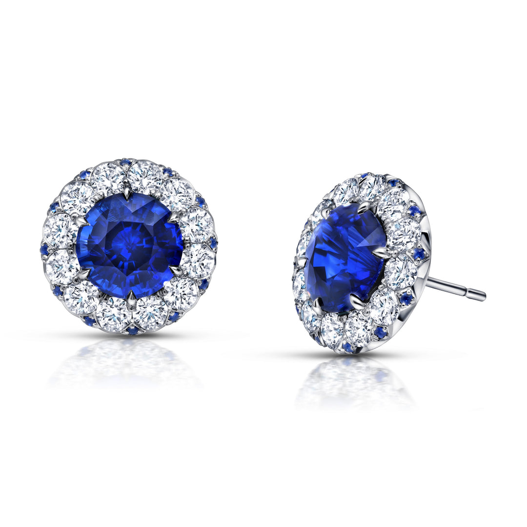 A classic pair of studs with a twist! These stunning and well-crafted peek-a-book Sapphire Studs feature two 5.25ctw+ Round Blue Sapphires surrounded by a bright and bold halo of white diamonds, 1.63ctw, with little pops of Blue Sapphire peeking out in-between each white diamond. This pair of earrings is for someone looking for Sapphire & Diamonds studs that no one else has! These earrings shown have SOLD. To inquire about custom creating another pair, please email info@nicolemera.com.