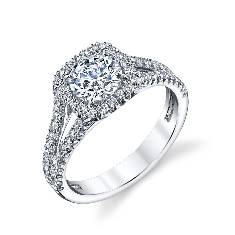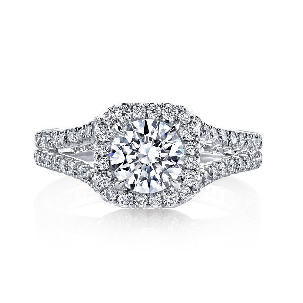 This classic split shank cushion halo Platinum ring shown features a 1.00ct Round Brilliant Diamond center. Video is showing a 2.00ct Round Brilliant Diamond Center.