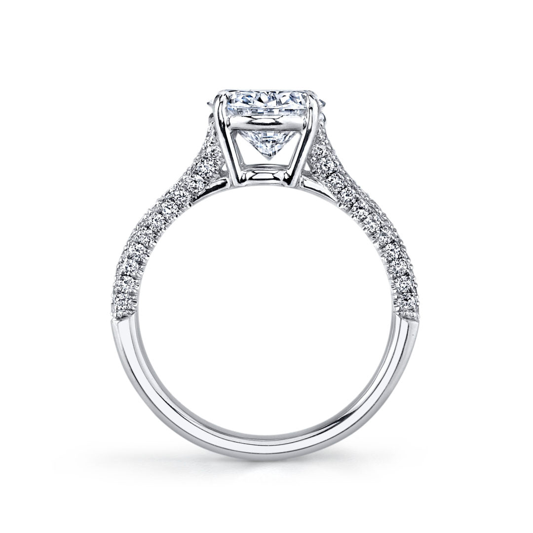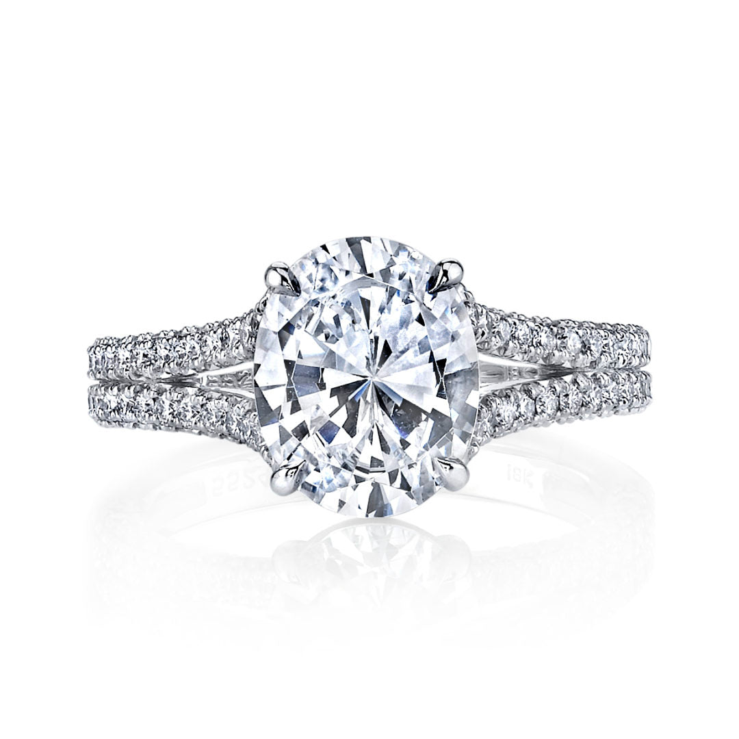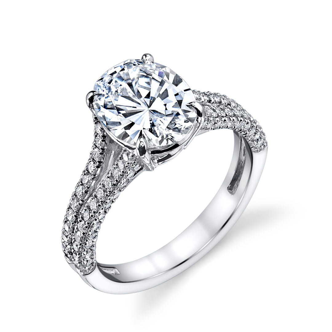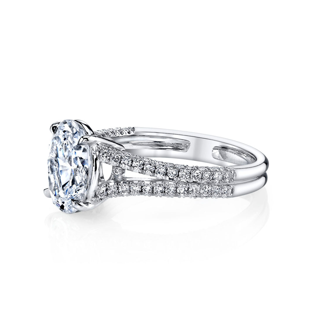 This split shank ring shown is set with a 2.50ct Oval Diamond center and 80 Round Brilliant Diamonds, weighing 0.71ct.
